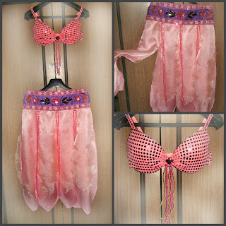 Костюм состоит из двух частей.Лиф-готовый бюстгалтер обтянут трикотажной тканью с пайетками. Украшен бусинами и камушком,бретели расшиты пайеткам.